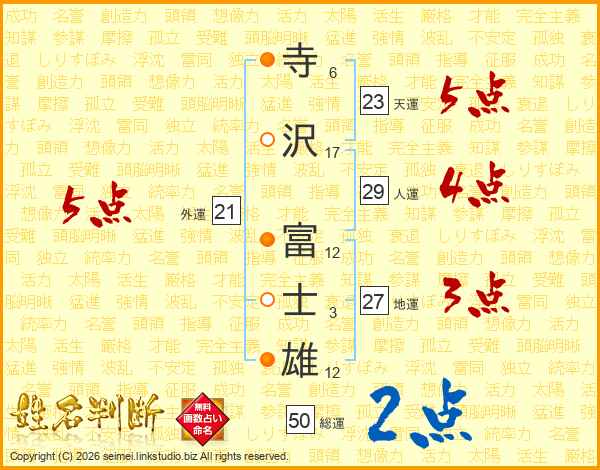 寺(6画)沢(17画) 富(12画)士(3画)雄(12画)
