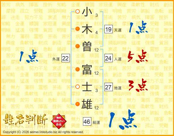 小(3画)木(4画)曽(12画) 富(12画)士(3画)雄(12画)