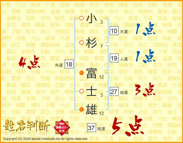 小(3画)杉(7画) 富(12画)士(3画)雄(12画)