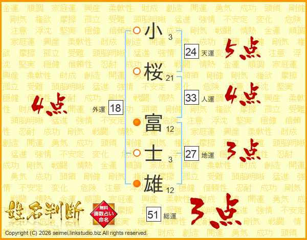 小(3画)桜(21画) 富(12画)士(3画)雄(12画)