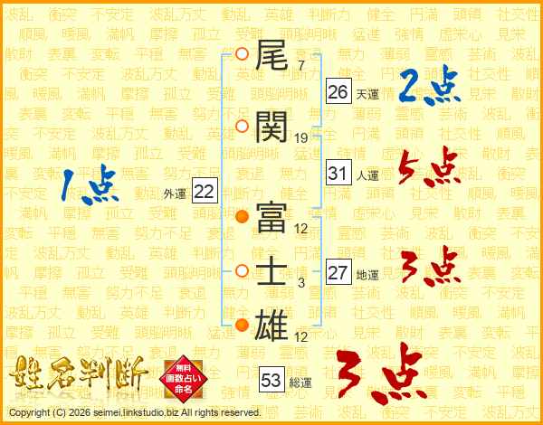 尾(7画)関(19画) 富(12画)士(3画)雄(12画)
