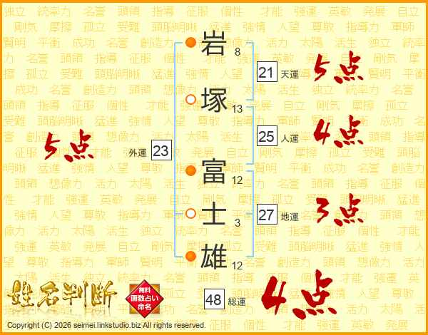 岩(8画)塚(13画) 富(12画)士(3画)雄(12画)