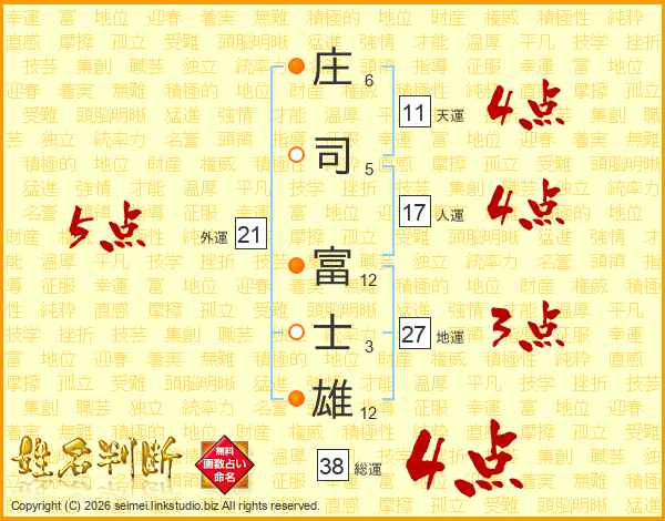 庄(6画)司(5画) 富(12画)士(3画)雄(12画)