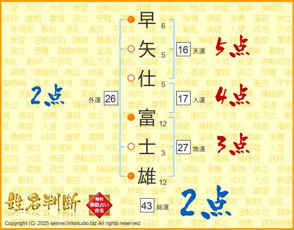 早(6画)矢(5画)仕(5画) 富(12画)士(3画)雄(12画)