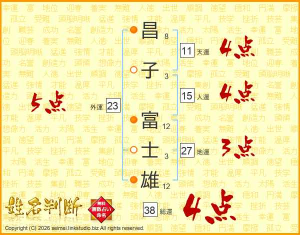 昌(8画)子(3画) 富(12画)士(3画)雄(12画)