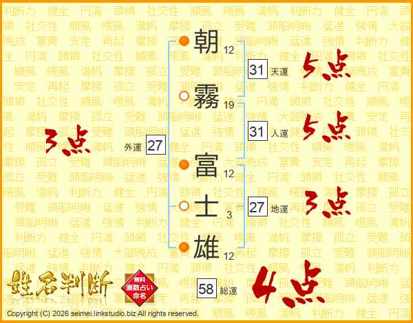 朝(12画)霧(19画) 富(12画)士(3画)雄(12画)