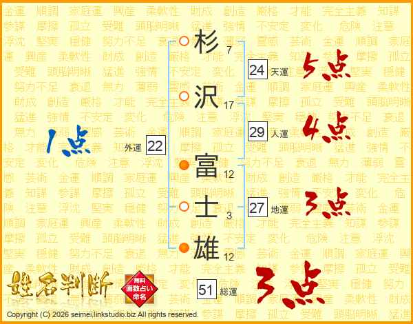 杉(7画)沢(17画) 富(12画)士(3画)雄(12画)