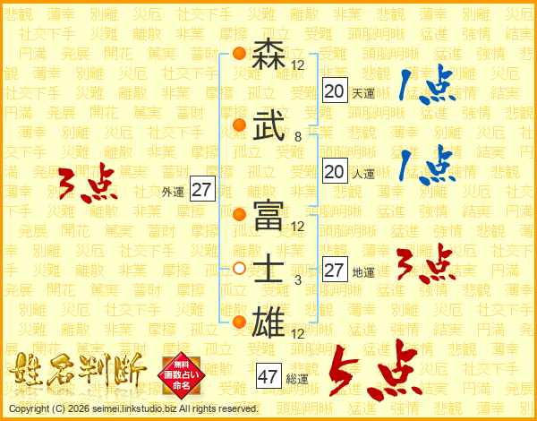 森(12画)武(8画) 富(12画)士(3画)雄(12画)