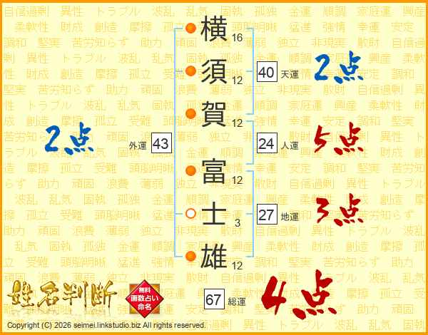 横(16画)須(12画)賀(12画) 富(12画)士(3画)雄(12画)