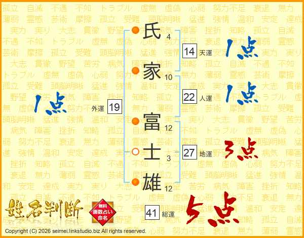 氏(4画)家(10画) 富(12画)士(3画)雄(12画)