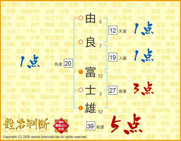 由良富士雄さんの総運は39画の5点!