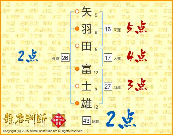 矢(5画)羽(6画)田(5画) 富(12画)士(3画)雄(12画)