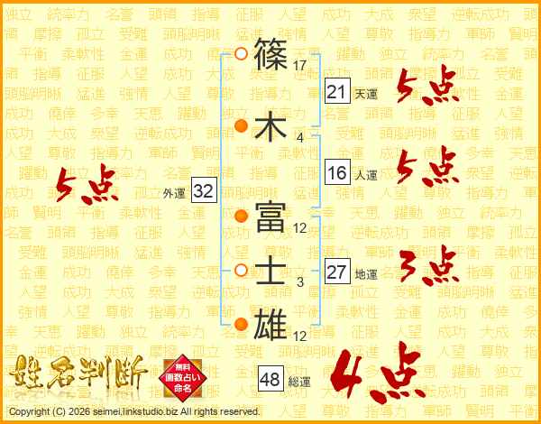 篠(17画)木(4画) 富(12画)士(3画)雄(12画)