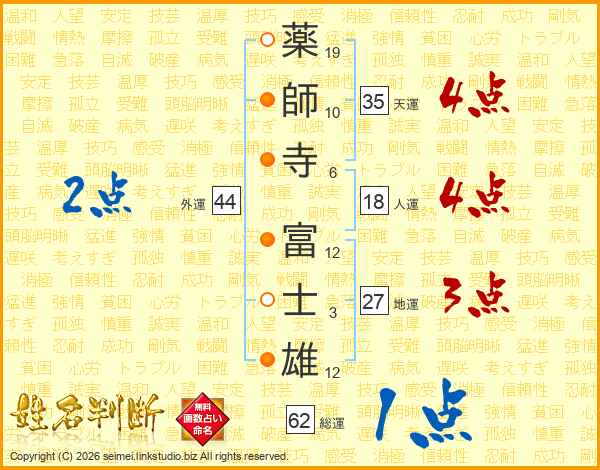 薬師寺富士雄さんの地運は27画の3点!