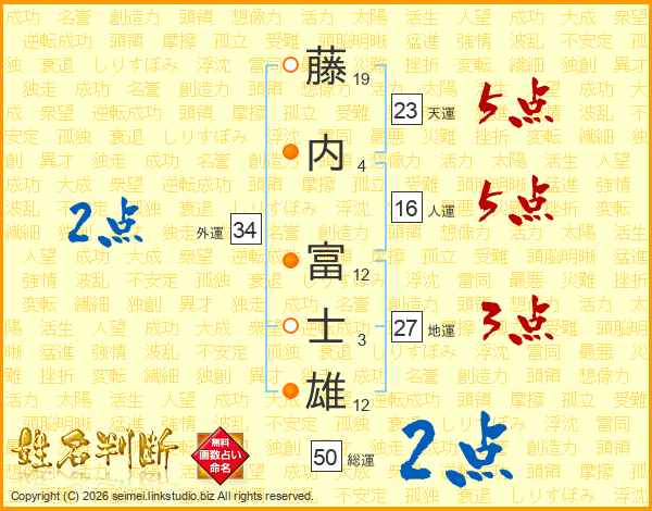 藤(19画)内(4画) 富(12画)士(3画)雄(12画)
