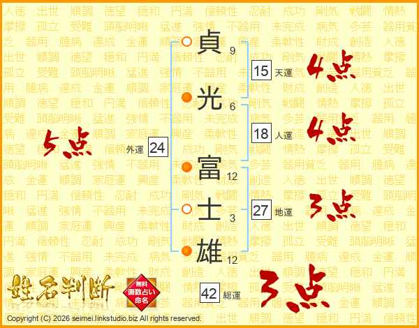 貞(9画)光(6画) 富(12画)士(3画)雄(12画)