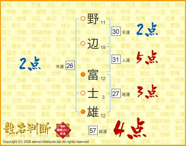 野(11画)辺(19画) 富(12画)士(3画)雄(12画)