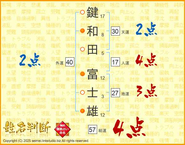 鍵(17画)和(8画)田(5画) 富(12画)士(3画)雄(12画)