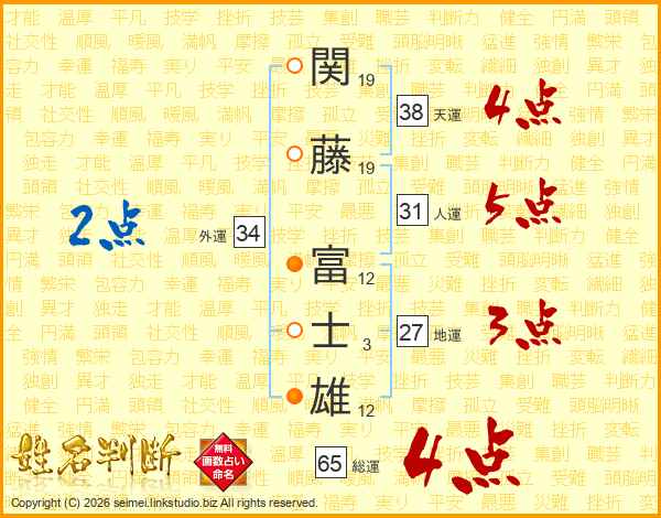 関(19画)藤(19画) 富(12画)士(3画)雄(12画)