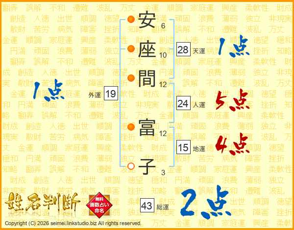 安(6画)座(10画)間(12画) 富(12画)子(3画)