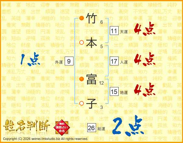 生活面を象徴する運勢です。外部から受ける影響力を表し、結婚運、家庭運や職場、環境への順応性を表します。総運から人運を引いた画数。姓や名が1文字の場合を除く。