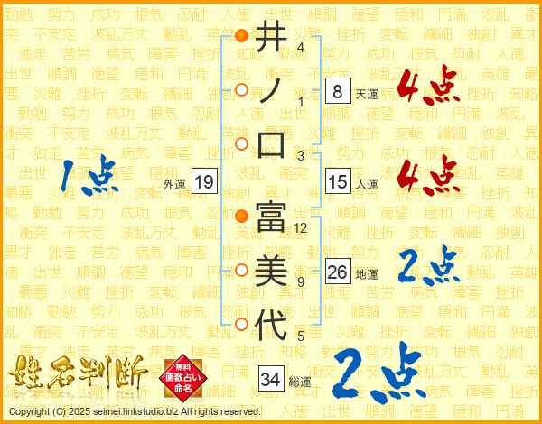 井(4画)ノ(1画)口(3画) 富(12画)美(9画)代(5画)