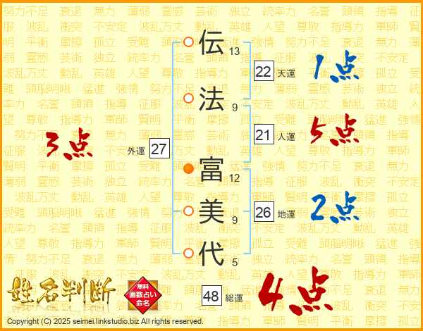 伝(13画)法(9画) 富(12画)美(9画)代(5画)