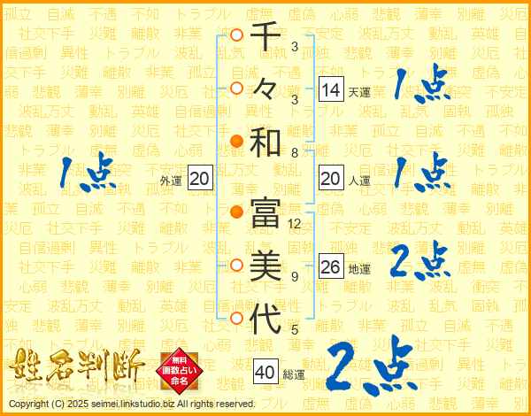 千(3画)々(3画)和(8画) 富(12画)美(9画)代(5画)