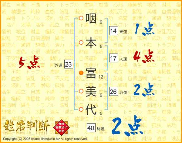 咽(9画)本(5画) 富(12画)美(9画)代(5画)