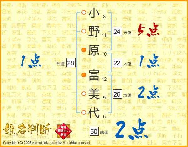 小(3画)野(11画)原(10画) 富(12画)美(9画)代(5画)