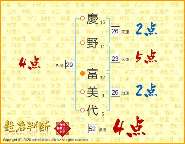 慶野富美代さんの天運は26画の2点!