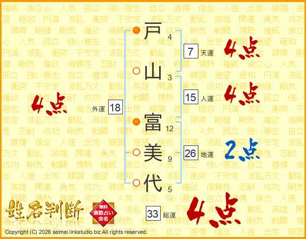 戸(4画)山(3画) 富(12画)美(9画)代(5画)