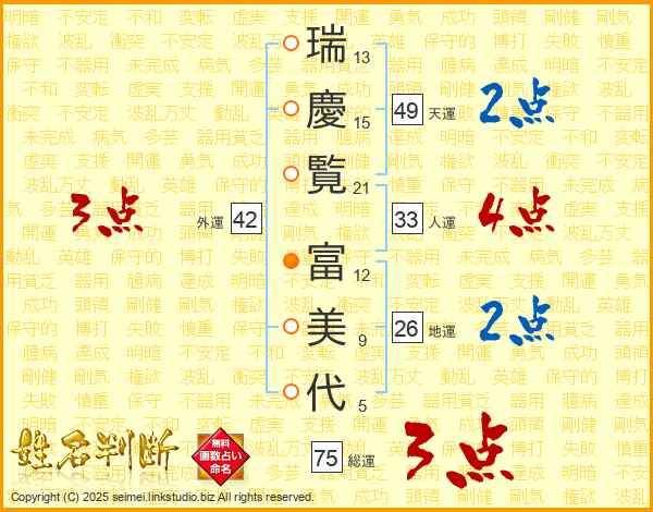瑞(13画)慶(15画)覧(21画) 富(12画)美(9画)代(5画)