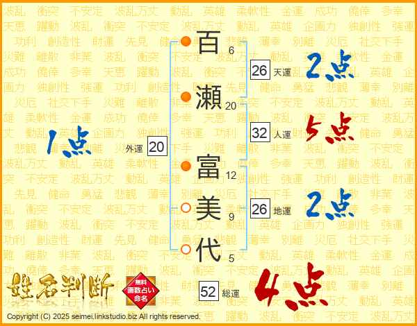 百(6画)瀬(20画) 富(12画)美(9画)代(5画)