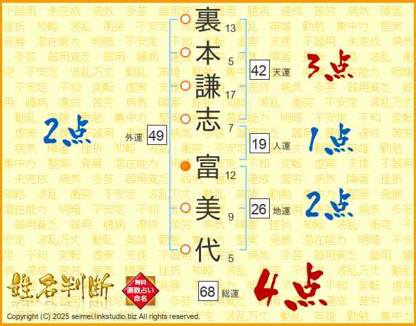 裏本謙志富美代さんの総運は68画の4点!