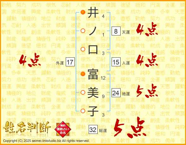 井(4画)ノ(1画)口(3画) 富(12画)美(9画)子(3画)
