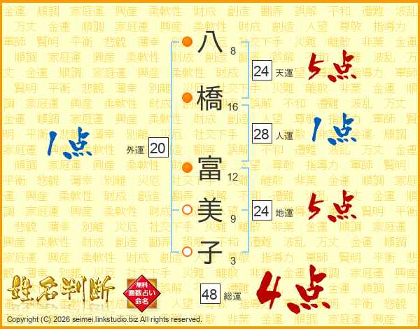 八(8画)橋(16画) 富(12画)美(9画)子(3画)