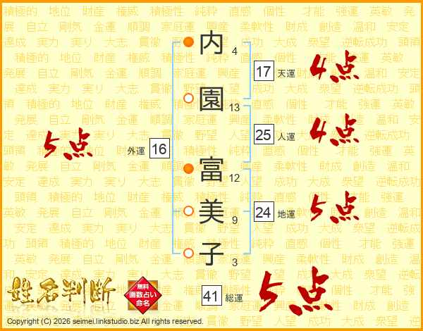 内(4画)園(13画) 富(12画)美(9画)子(3画)