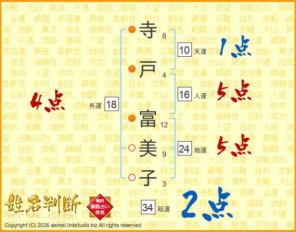 寺(6画)戸(4画) 富(12画)美(9画)子(3画)