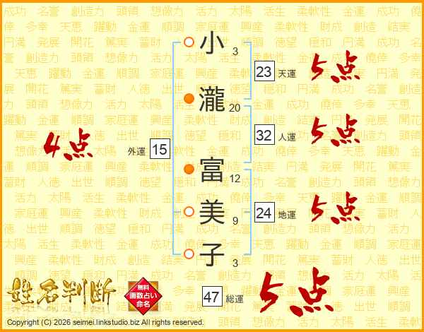 小(3画)瀧(20画) 富(12画)美(9画)子(3画)