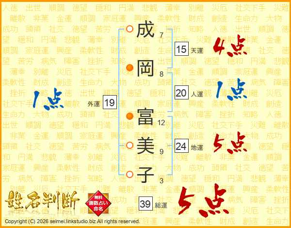 成(7画)岡(8画) 富(12画)美(9画)子(3画)