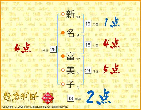 新(13画)名(6画) 富(12画)美(9画)子(3画)