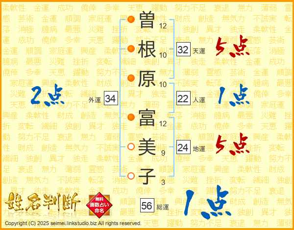 曽(12画)根(10画)原(10画) 富(12画)美(9画)子(3画)