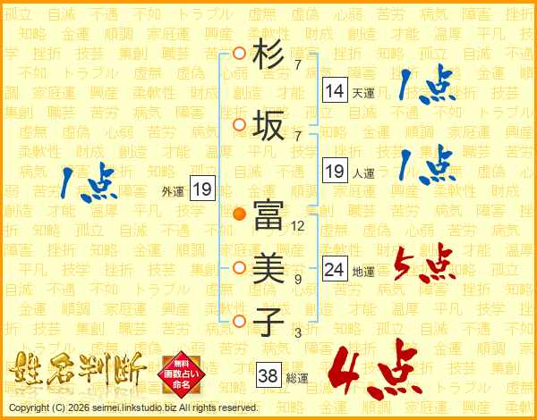 杉坂富美子さんの総運は38画の4点!
