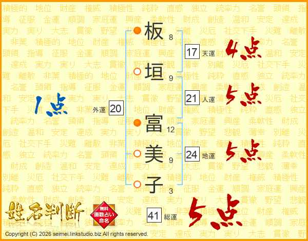 板(8画)垣(9画) 富(12画)美(9画)子(3画)