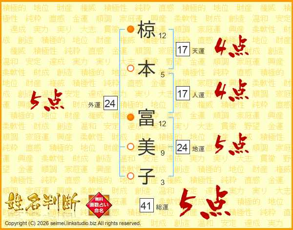 椋(12画)本(5画) 富(12画)美(9画)子(3画)