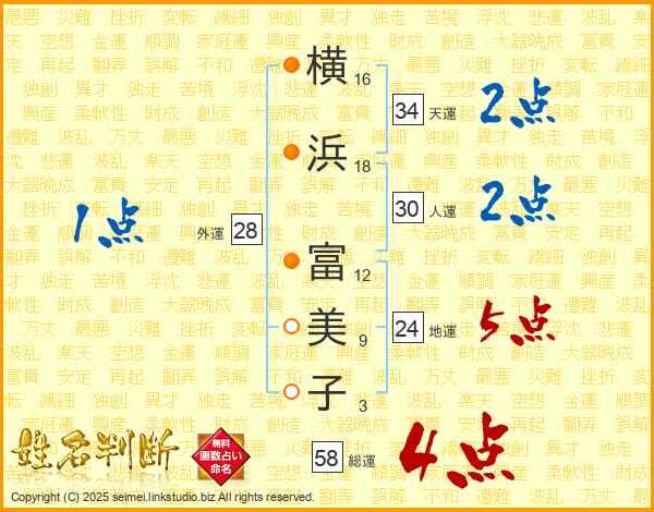 横浜富美子さんの総運は58画の4点!
