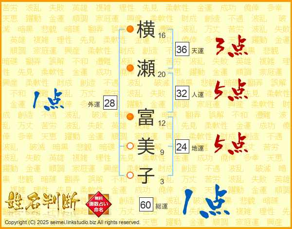横(16画)瀬(20画) 富(12画)美(9画)子(3画)