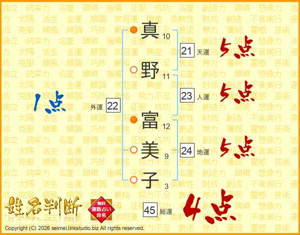真(10画)野(11画) 富(12画)美(9画)子(3画)