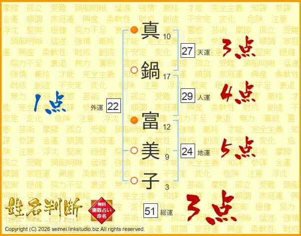 真(10画)鍋(17画) 富(12画)美(9画)子(3画)